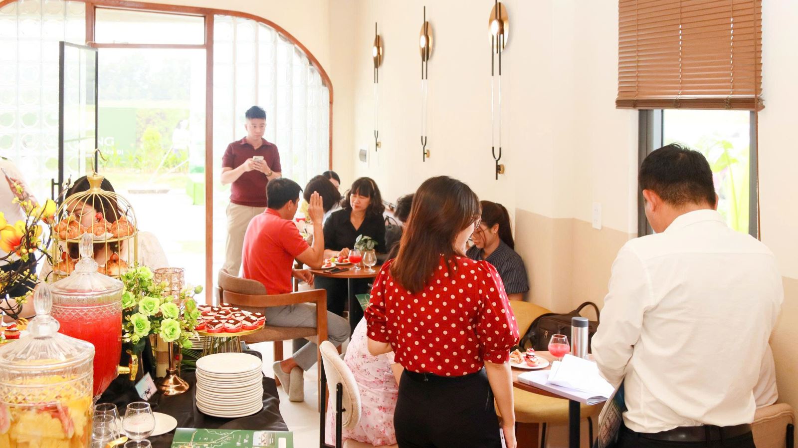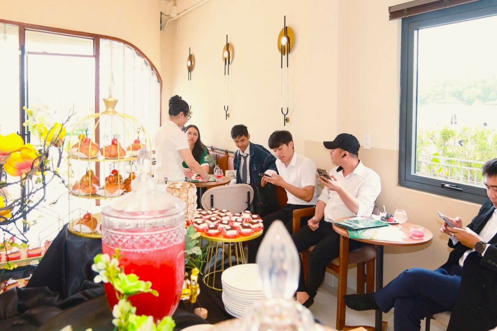 Từ buổi sáng, khách mời được đón tiếp trong không gian ấm cúng với tea break nhẹ nhàng, thưởng thức tách trà thơm dịu, bánh ngọt tinh tế và check-in tại các góc decor được chăm chút tỉ mỉ – nơi mọi người lưu lại những khoảnh khắc thư thái bên người thân và bạn bè.