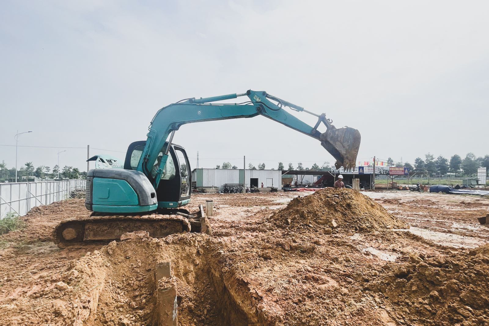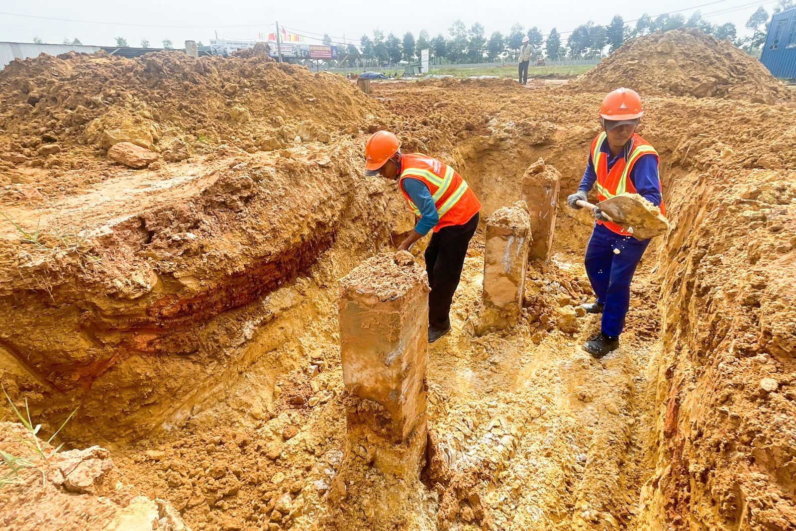 🔹 Đào đất, chuẩn bị làm móng Song song đó, công tác đào đất và chuẩn bị nền móng được thực hiện liên tục, đảm bảo các yêu cầu kỹ thuật và an toàn thi công.