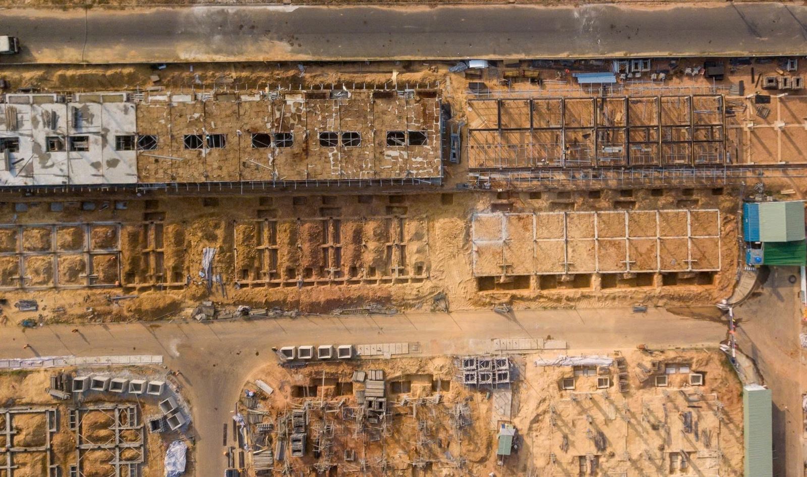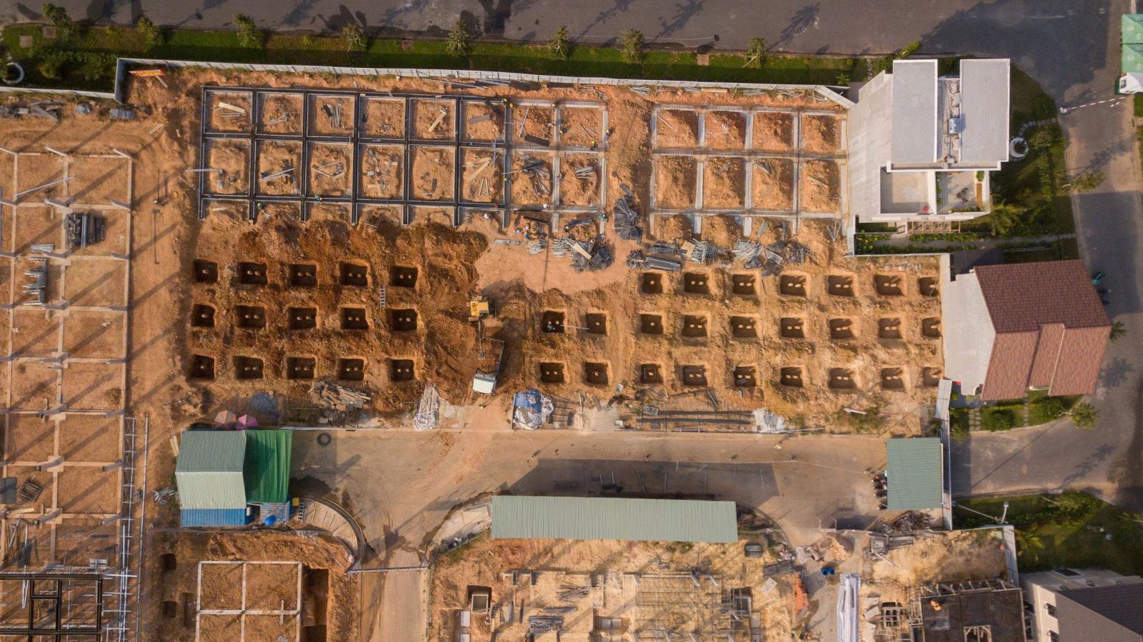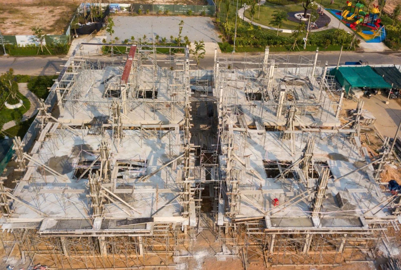 Khu biệt thự: Thi công đồng loạt phần thô, hoàn thiện móng đến xây dựng các tầng, từng bước hiện rõ hình dáng không gian sống cao cấp.
